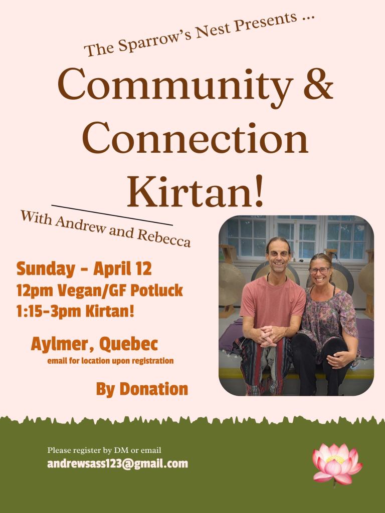 - Sunday Apr 12 – Potluck lunch and kirtan with Andrew & Rebecca (other dates planned: May 16)