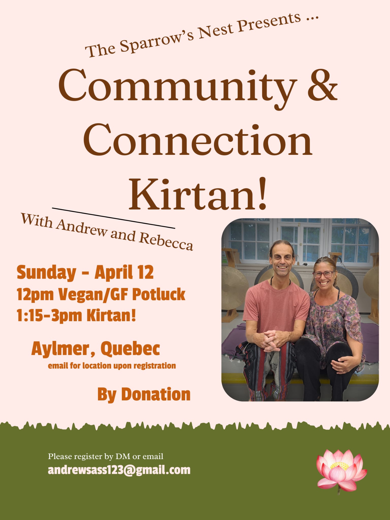 Sunday Apr 12 – Potluck lunch and kirtan with Andrew & Rebecca (other dates planned: Saturday May 16)