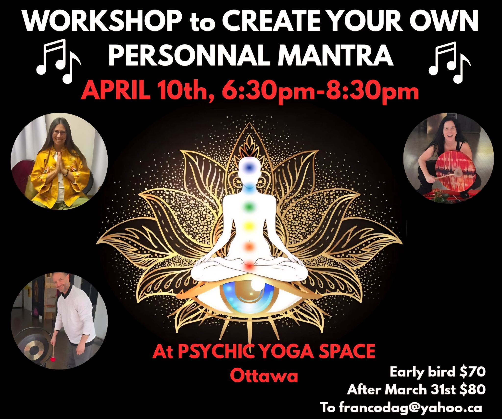 - 6:30 – 8:30 pm @ 131 Bank Street Ottawa (Phychic Yoga Space)